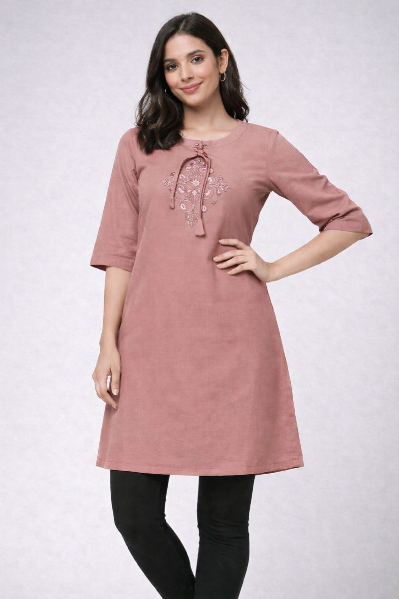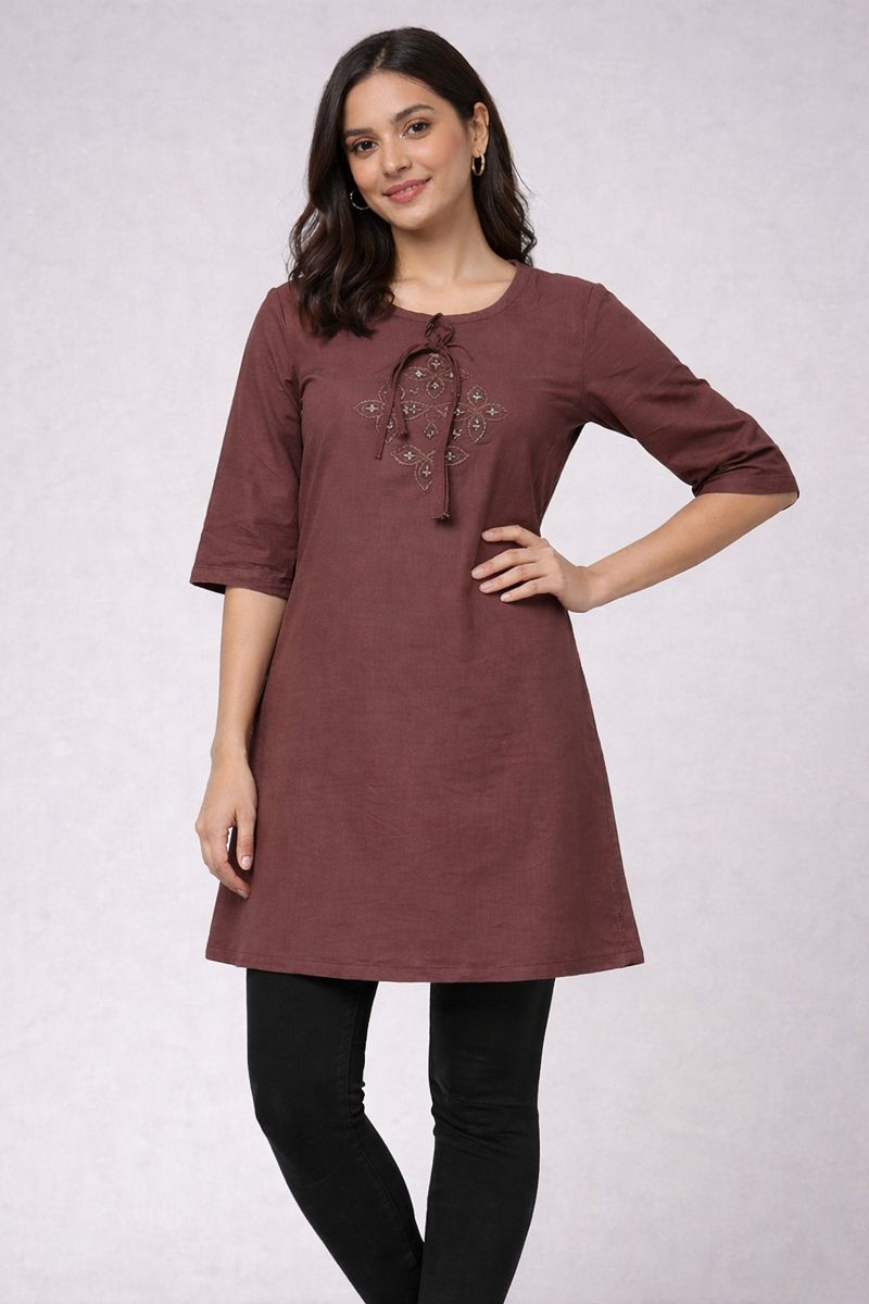 The breathable fabric offers a smooth feel and a graceful fall, making it ideal for all-day wear. Finished with three-quarter sleeves and a flattering above-knee length, this tunic pairs perfectly with leggings, trousers, or jeans for a refined yet relaxed look.