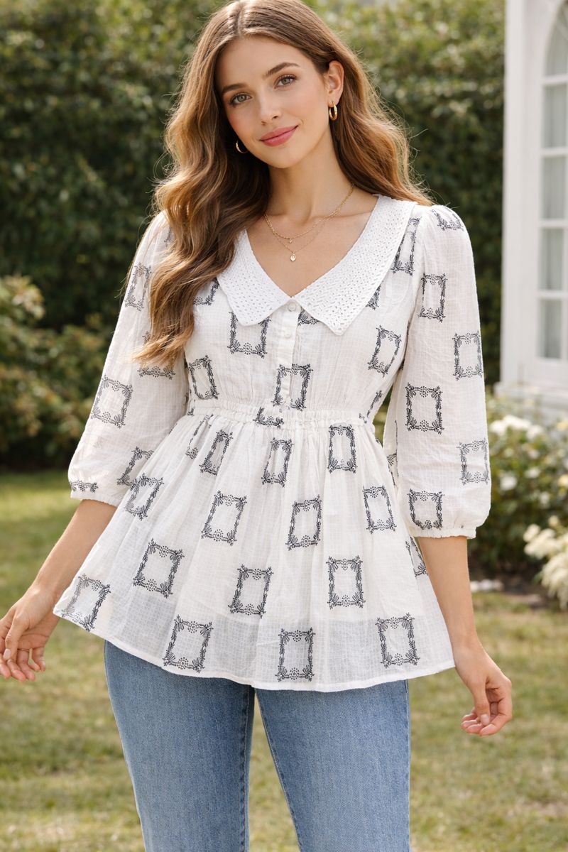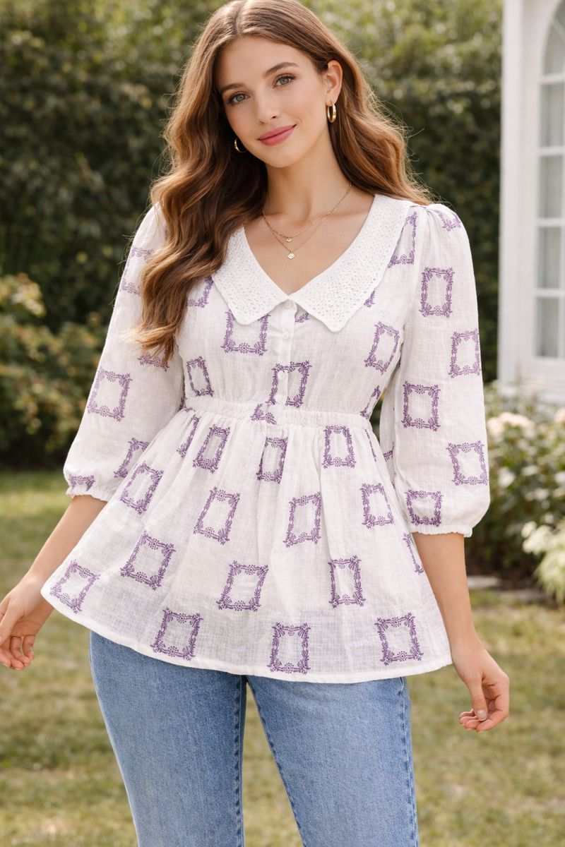 Upgrade your everyday style with this elegant embroidered peplum top, crafted in soft, breathable cotton fabric. Designed with a delicate lace-detailed collar, front button placket, and three-quarter sleeves, this top offers a flattering fit with a gently flared hem. The subtle geometric embroidery adds a graceful touch, making it perfect for both casual and semi-formal wear.